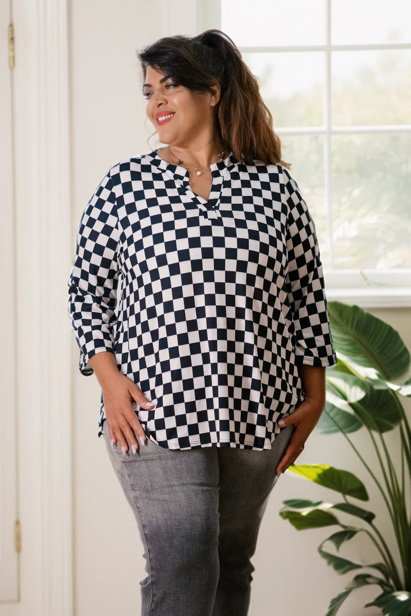 Introducing our Checkmate Babe Top - it'll have you feeling like a winner! This top features a unique crisscross checkered pattern that will make a statement wherever you go. With a flattering fit and comfortable fabric, this top is sure to be your new go-to. Make your move and add it to your wardrobe today!