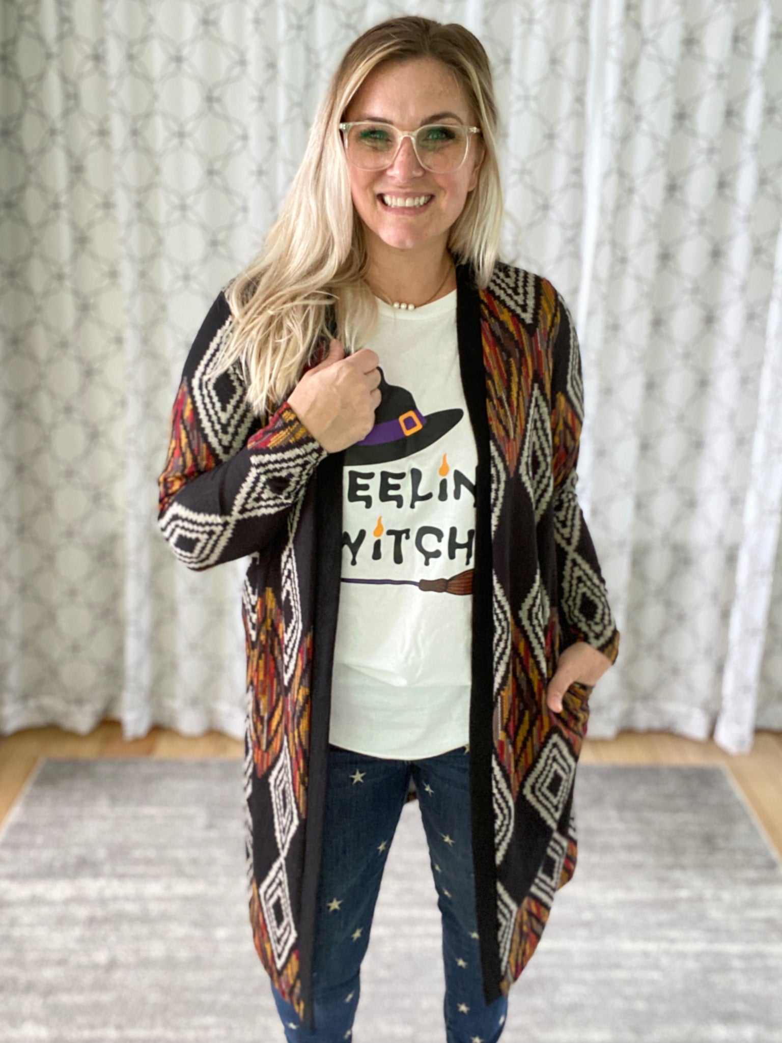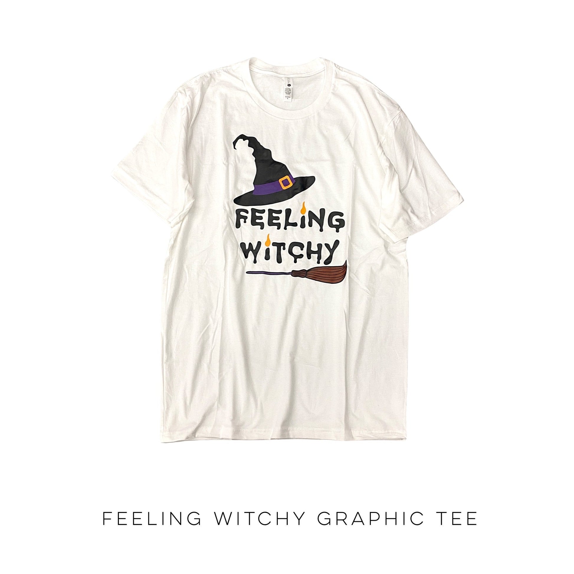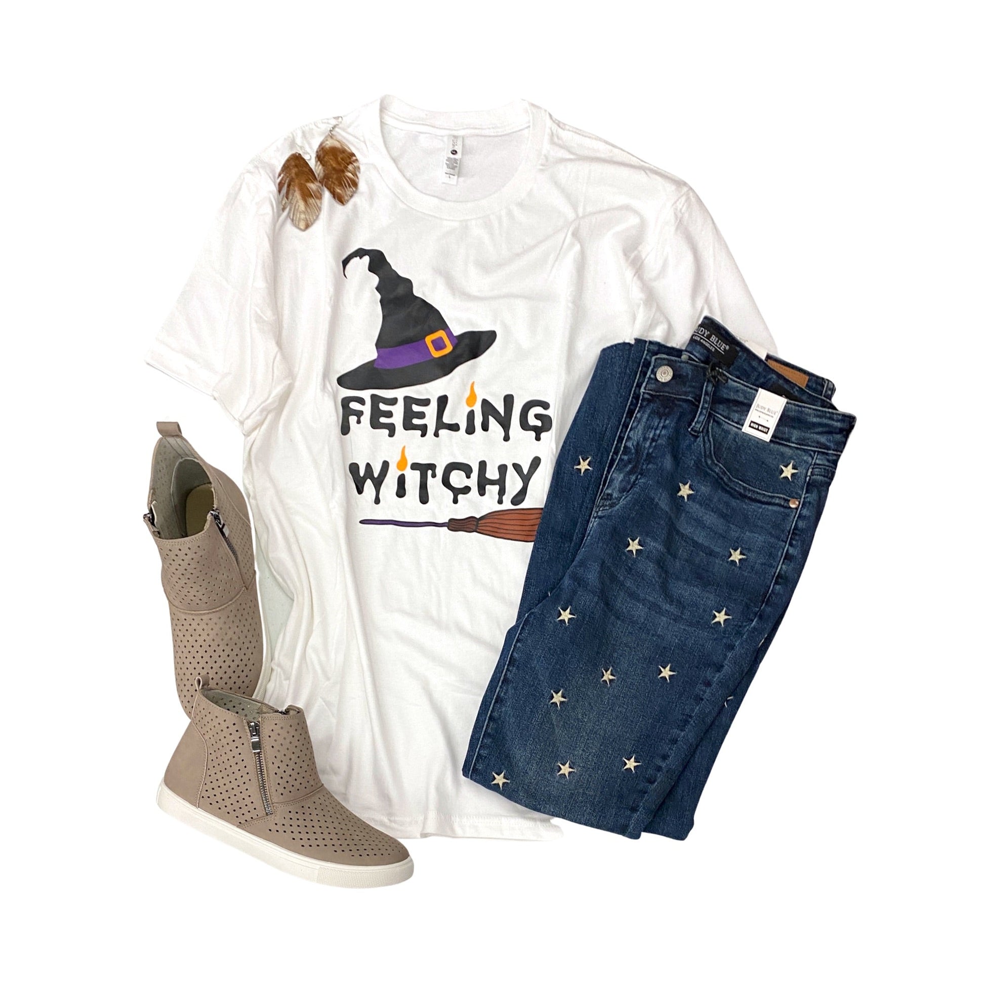 Feeling Witchy? This is the tee for you! With a witch hat, candles and a broom you are all set for Halloween! Pair with one of our black Judy Blue jeans and Perfect Halloween Cat Earrings to complete the look.