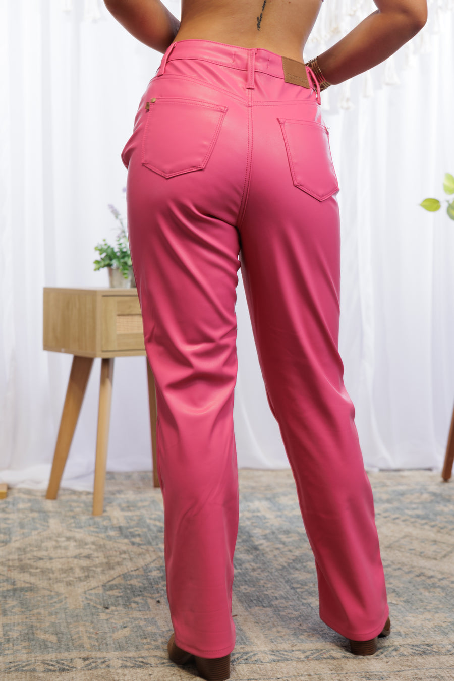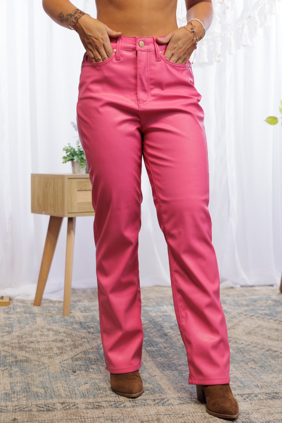 Ready to get a little wild? Our Hey Girl! Tummy Control Judy Blue's are the perfect way to unleash your inner vixen. This hot pink faux leather denim features straight cut legs, a high waist, and a tummy control pannel designed to keep you looking's sizzlin' hot! Plus, with amazing stretch, you can strut around town without worrying about feeling too constricted.