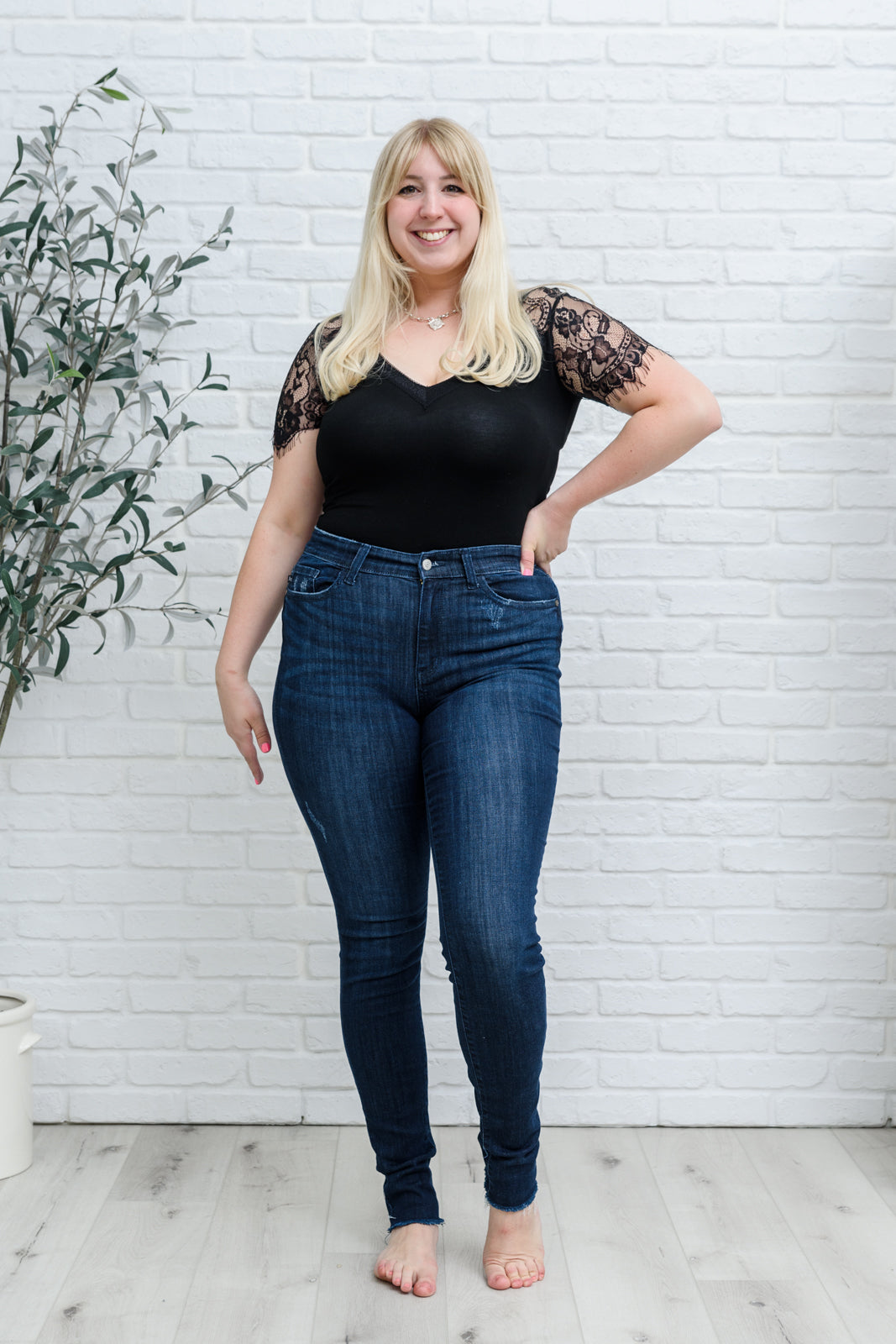 Cuffed or uncuffed, the Maeve Jeans by Judy Blue fit amazing and FINALLY - a style that is also perfect for tall ladies! Soft and stretchy with minimal distressing, the Maeve is a Fall wardrobe essential and the beautiful dark Indigo wash will never go out of style. Wear cuffed for a trendy vibe or wear uncuffed for extra length and a sleek look. The Maeve pairs with all of your favorite footwear and the slim design will also tuck well into tall boots. This style is everything you want in a dark wash denim this season.