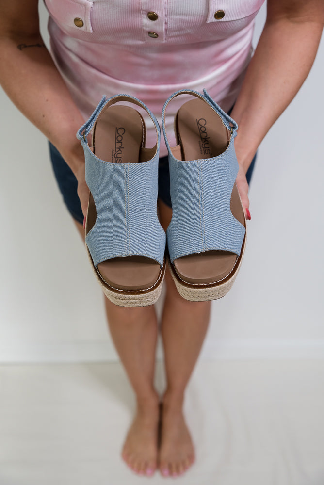Add style to your outfit with these fantastic wedges! Easily slide on these denim Freddie wedges with the adjustable hook and loop strap. Corkys is known for their comfortable shoes, and the foam footbed gives you all day comfort so you can wear them to any event.