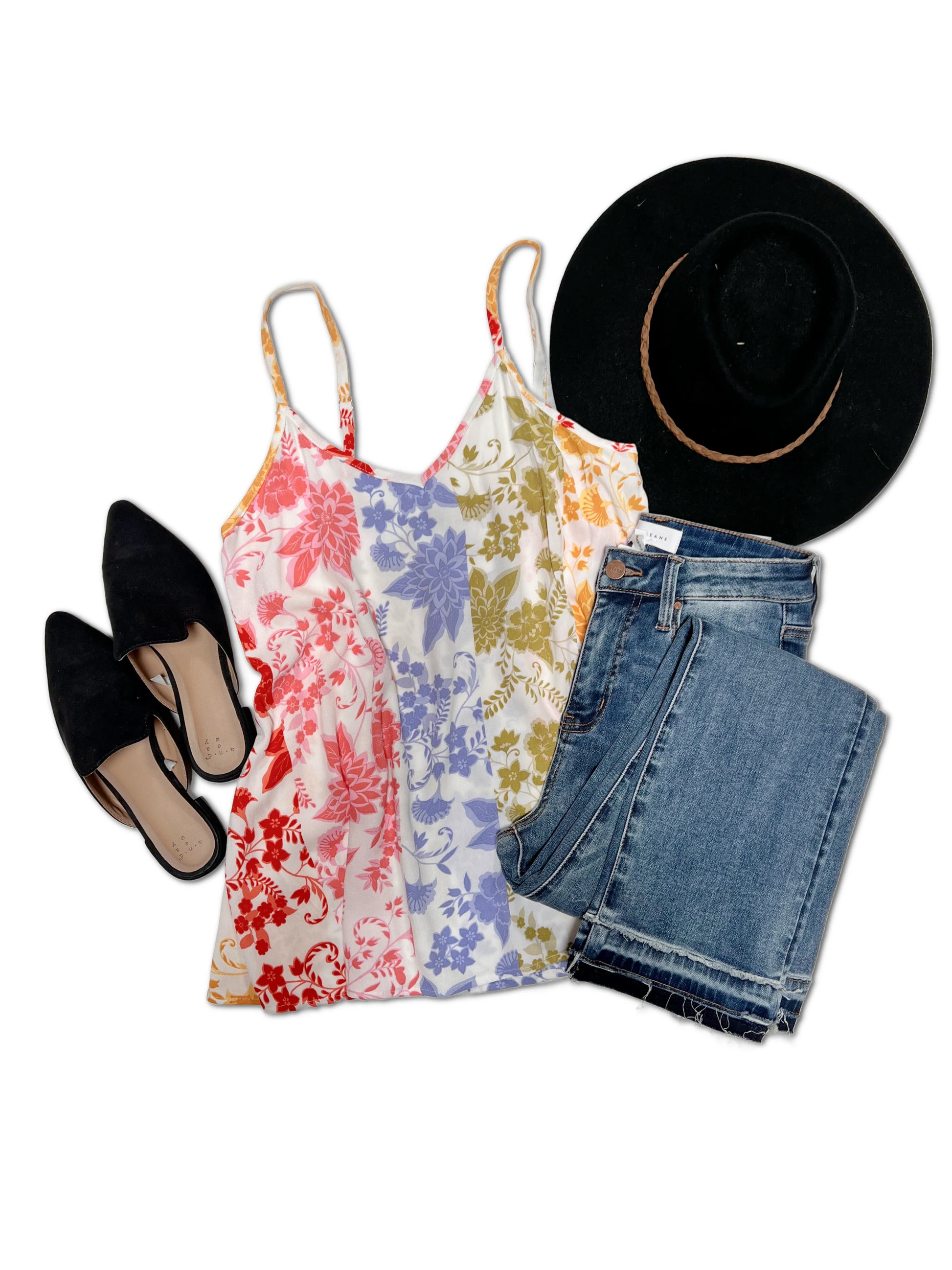 Unleash your soul's desire with our floral print tank! Its adjustable spaghetti straps and relaxed fit offer a comfortable and customizable fit, while the v-neck adds a touch of style. Perfect for adding a pop of color to your wardrobe. (No more boring tanks for you!)